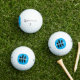 Elegante Geschenkidee für einen Golfspieler.. ein Ball mit seinem Namen (Schriftart mit weißer Sans Serif) und ein Anfangsbuchstabe (schwarze Schrift), der auf einem Logo mit blauer Kreuzung gedruckt wurde.. um die Golfbälle Vaters im Golfclub leicht zu erkennen.