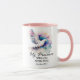 Die christliche Kaffee-Tasse mit inspirierender Zitat-Schrift zeigt eine wunderschöne weiße Taube, die durch den Himmel fliegt, ihre Flügel mit blauen und Lavendelblüten verziert. Es enthält einen ermutigenden Bibelverse Exodus 33:14, "Meine Gegenwart wird mit dir gehen, und ich werde dir Erholung geben."