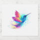Heller, schillernder, exotischer, fliegender Kolibri auf weißem Hintergrund, übermalt mit mehrfarbiger Aquarellfarbe. Regenbogen-Kolibri.