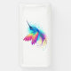 Heller, schillernder, exotischer, fliegender Kolibri auf weißem Hintergrund, übermalt mit mehrfarbiger Aquarellfarbe. Regenbogen-Kolibri.