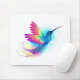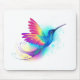 Heller, schillernder, exotischer, fliegender Kolibri auf weißem Hintergrund, übermalt mit mehrfarbiger Aquarellfarbe. Regenbogen-Kolibri.