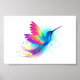 Heller, schillernder, exotischer, fliegender Kolibri auf weißem Hintergrund, übermalt mit mehrfarbiger Aquarellfarbe. Regenbogen-Kolibri.