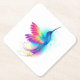 Heller, schillernder, exotischer, fliegender Kolibri auf weißem Hintergrund, übermalt mit mehrfarbiger Aquarellfarbe. Regenbogen-Kolibri.