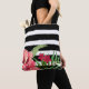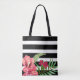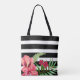 Einfache schwarz-weiße Streifen und exotische rosa Blume. Maßgeschneiderte Taschenvorlage