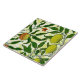 Keramikfliese in einem Kunst Williams Morris Nouveau Muster der Zitronen und der Pfirsiche, mit Blüten, auf belaubten Niederlassungen - tragen Sie in Gelbem Früchte und korallenrote Orange, mit Grünem verlässt, gegen einen gemusterten, gelben und weißen Hintergrund