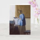 Schöne Kunstmalerei von werdender Mutter in blau oben. Sie ist neben einem Fenster stehend, das einen Brief liest. Weiches Bild von Johannes Vermeer.