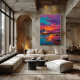 Farbige expressionistische Skyline-Kunst, inspiriert von Sydney, mit dem berühmten Opernhaus und der Harbour Bridge, die bei Sonnenuntergang im Hafen gespiegelt werden. Kräftige Texturen und lebendige Farben schaffen ein dramatisches Stadtbild voller Atmosphäre, perfekt für Liebhaber von Sydney und moderner expressionistischer Stadt-Kunst.
