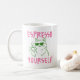 Bringen Sie ein bisschen Freude in Ihren täglichen Kaffeerituale mit diesem spielerischen "Espresso Yourself"-Becher. Mit einer charmanten Strichzeichnung einer Katze in coolem Sonnenbrille, die fröhlich ihre eigene winzige Tasse Kaffee schlürft, verbindet dieses Design Humor, Persönlichkeit und eine Prise Launen. Die helle rosa Schrift verleiht der Nachricht einen lustigen Farbakzent, ohne die saubere weiße Keramik zu überfordern. Perfekt für Kaffeeliebhaber, Katzenliebhaber oder jeden, der einen guten Wortwitz schätzt, macht dieser Becher den Morgen leichter und das Verschenken einfacher. Ob für Ihren Schreibtisch, Ihre Küche oder einen Freund, der ein Lächeln braucht, ist er eine fröhliche Erinnerung, man selbst zu sein - mutig und koffeinhaltig.