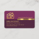 Overleaf, in a dark purple cover, card details are over on the right. At the top is the gold logo followed by the business name, its contact details and a slogan caption option. All lettering are in faux gold.