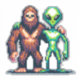 Pixel Art 8-bit bigfoot sasquatch und extraterrestrial Alien sind Freunde in einer Gaming-Vibe-Auflösung.