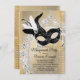 Maskerade Party Einladung mit eleganter schwarzer Federmaske auf einem schönen goldenen Hintergrund. Diese extravagante Schwarz-Gold-Maskierung-Party Einladung ist einfach für Ihre Veranstaltung angepasst, indem Sie Ihre Details in den Schriftart-Stil und den Wortlaut Ihrer Wahl.