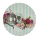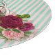 Die extravagante Rundholzplatte mit rosa und aqua gestreiftem Hintergrund, rosa und bordeauxfarbenem Blumenstrauß und Vintager Alice im Wunderland Cheshire Cat Illustration.
