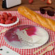 Hibiskus mit Blumenmuster nah - eleganter weißer und rosa Papierteller für die Hochzeitsdekoration.