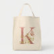 Extravaganter rosa Glitzer Buchstabe K mit goldenen Blätter und Wirbel Overlay und einem Kupferschmetterling auf grauem Hintergrund.