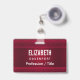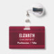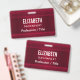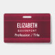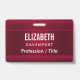 Ein Namensschild mit rotem Hintergrund, der mit eleganten Wirbel und dekorativen Designs an den Rändern geschmückt ist.