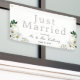 Feiern Sie die fröhliche Heiratsreise mit unserem eleganten "Just Married"-Design, das mit feinen weißen Blume geschmückt ist. Ideal, um dem Pärchen eine Touch von Launen und Charme zu verleihen, ist es eine wunderbare Möglichkeit, den Status der Neuvermählten im Stil anzukündigen.