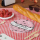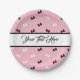 fertigen Sie die Hintergrundfarbe und -text auf diesem Pappteller besonders an, der geschwollene Schwarzweiss-Bögen in einem Tupfenmuster kennzeichnet