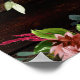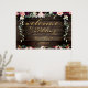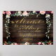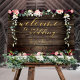 Ein 36 x 24 Zoll großes Plakatbrett mit rustikalem, Vintagem Holzhintergrund. Ein Haufen tiefbordeauxroter und rot-rosa Blumen kaskadiert inmitten von silbernen Grüngärten und romantischen Blumenbouquets in Kerzenlicht, die mit Blume aus Birnen und Blumen bestechen.