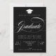 Eine elegante Abschluss-Einladung mit einem weißen Graduierungsdeckel mit Imitaten goldenen Tassels, und "Graduate" in weißen Drehbuch-Kalligraphie-Schriftart, auf einem schwarzen Hintergrund. Das Gegenteil ist in schwarz.