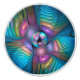 Ein buntes, wirbelndes Fraktal, das an strukturierte Flügel erinnert, die eine zentrale Kugel umgeben. Das Fraktal wird in Miniatur auf der Kugel wiederholt.