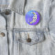 Dieser runde Button-Backbutton hat einen extravaganten, halbmondfarbenen Mond mit blauen Augen und rosa Lippen und bunten abstrakten Formen in lila, blau und gelb.