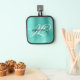 Erstellen Sie Ihre eigenen personalisierten Quadrat-Pothalter für Monogramm. Girly Imitate helle türkisfarbene aquamarine metallische Folie. Passen Sie die Stile des Schriftartes an, um Ihr eigenes Design für ihre besondere Feier zu kreieren.