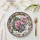 Dieses Vintage Halloween Paper Plate zeigt eine schwarz-weiße Skeletthand, die von rosa Rosen gezeichnet ist. Zu den weiteren Elementen gehört ein Vintager Zeitungshintergrund. Die Gestaltung an der Außenseite der Platte erinnert an Vintage Transferware-Teller.