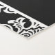 Ein weißer Damast auf schwarzem Hintergrund (vorne und hinten zweiseitig). Personalisierter Text in einem extravaganten klassischen Schriftzeichen (nur auf der Vorderseite, aber man kann ihn kopieren und auf der Rückseite einfügen). Maßgeschneiderter Stil und Größe des Schriftartes. Sie können auch den Rahmen und die Farbe der rechteckigen Form für den Namen ändern.