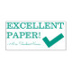 Dieses lustige Design aus Gummi-Briefmarke beinhaltet die ermutigende Botschaft "EXCELLENT PAPER!" und einen personalisierten Lehrernamen. Es ist auch mit einem dekorativen Karo versehen. Es könnte von einem Lehrer, Pädagogen oder Tutor verwendet werden, um zu bestätigen, dass der Schüler gut abgeschnitten hat.