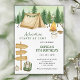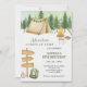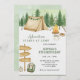 "Birthday invitation with a camping theme. Features a tent, trees, and campfire illustration. Text reads: 'Adventure Starts at Camp. Sophia's 8th Birthday. July 30, 1 PM. 285 Willow Lane, Spruce Hill. RSVP 123-456-7890.' The back is blank."