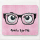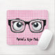 Schwarze Brillen mit Augenbrauen und Wimpern auf weißem und rosa Gingham Hintergrund.