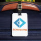 Ein Gepäckanhänger, der das F# Software-Grundlagenlogo für F# auf der Front zeigen, und das Logo gemasert in der Orange auf der Rückseite.
