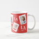 Spaß und festliche Foto Tasse. Unser lustiges Porto-Briefmarke-Design bietet unseren lustigen Weihnachtsmann, Mrs.-Klausel und ein lustiges typografisches fa la design. Fügen Sie Ihre Fotos auf drei der Porto-Briefmarke Designs und Namen. Von Moodthology Papery entworfen