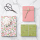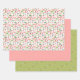 Fantastisches Weihnachtsunterhaltspapier mit rosa Flamingo-Muster auf weißem Hintergrund, Weihnachts-Saitenlichtmuster auf pear-grünem Hintergrund und solidem rosa Hintergrund. Flamingo Muster umfasst festliche Flamingos, Papageien, Schneemobile, Palmen mit einigen von ihnen haben Saitenlichter, Ananas und verpackte Geschenke.