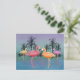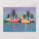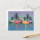 Grafische Aquarellmalerei aus Himmel, Wasser und Grün und Illustration von Flamingos und Bäumen. Flamingo Ballerinas tanzen auf dem Wasser und scheinen zu schwimmen.