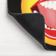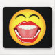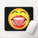 Lächelndes Gesicht © Sonnige Mars Designs. Dieses coole, humorvolle, lustige Maus-Matte- oder Mauspad illustriert ein gelbes lachendes Gesichtsgefühl mit offenem Mund, leuchtend weißen Perlenzähnen, Zunge und geschlossenen Augen. Konzept für den Spaß.