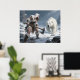 A fierce female warrior stands ready with her axe in a snowy landscape, face-to-face with an imposing polar bear. The scene conveys a sense of tension and bravery in the harsh, icy terrain.