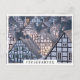 Postkarte der historischen Baukunst der Fachwerkhäuser mit Rauchschornsteinen und der Lichter am Beginn des Abends im Winter in der Stadt Freudenberg bei Siegen in Deutschland mit weißem Rand und in einer weißen Box den Text "Freudenberg".