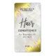 Haarpflegeprodukte wie Shampoo, Konditionierungs- und Aufbereitungsetiketten mit verblassender Goldfolie und opalem Glitzer auf Marmorboden.