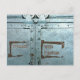 Türkisgraue Metalltür mit Schlössern, Rädern, Text und etwas zerrissenem Klebeband. Fotografiert in einem alten Gebäude in Wales, bearbeitet. Von Alexandra Cook aka Linandara.