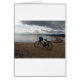 Ein Fahrrad am Strand. Ein Fahrradfahrer hält an und steigt von seinem Fahrrad aus, um auf einem alten zerfallenen Steg vor der Bucht von San Francisco angeln zu gehen.