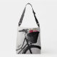 Stilvoller Querleichensack getan in einem natürlichen Leinenblick, mit Grafiken einer schwarzen Fahrrad-Silhouette, wenn der Korb mit rosa Blumen gefüllt ist. Personifizieren Sie den schwarzen Text für selbst oder als reizend Geschenkidee für sie.