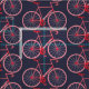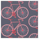 Dieser Stoff für Weihnachten hat ein sich wiederholendes Muster von roten Fahrrädern mit Kerzen roten und weißen Streifen auf dem Rahmen.