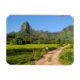 Der rechteckige Andenken-Foto-Magnet mit einem touristischen Radlerweibchen auf einer Schotterstraße mit Rotui-Berg im Hintergrund auf der tropischen Insel Moorea, in der Nähe von Tahiti, in Französisch-Polynesien.