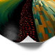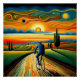 A.I. erstellt Druck von einer Person fährt ein Fahrrad auf einer kurvenreichen Straße in einer surrealen Landschaft von rollenden Feldern und Bäumen bei Sonnenuntergang.
