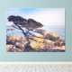 Ein einziger Zypressenbaum mit gegrabenen Ästen lehnt sich über eine felsige Küste, seine Silhouette umrahmt eine große Weite blauen Ozeans. Das dunkelgrüne Blattwerk des Baumes kontrastiert mit dem hellblauen Wasser und dem zarten Himmel und schafft ein Gefühl der Ruhe und Einsamkeit. Die Felsen unten sind eine Mischung aus braun und gelb, was auf das Vorhandensein von Lichen oder anderen natürlichen Verwitterung hinweist.
