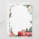 Schöne Grünpflanzen, Blumen- und Schneeflocken-Akzente mit einem roten Truck voller Weihnachtsbäume.