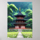 Ein serenischer japanischer Tempel inmitten eines üppigen Waldes: Ein traditioneller japanischer Tempel aus Holz steht hoch vor einer grünen Kulisse. Ein Weg, der zum Tempel führt, wird von unberührten, weißen Blume und grünem Gras flankiert und lädt die Besucher ein, diesen friedlichen Hafen zu erkunden. Die ruhige Atmosphäre des Waldes bietet den idealen Rahmen für Betrachtung und Reflexion.