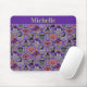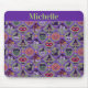 Dieses Mauspad hat ein niedliches Halloween-Pullover-Muster und basiert auf dem Thema der klassischen Fair Isle Strickdesigns. Das Muster besteht aus lila und grünen Kreisen und Diamantstreifen. Jede Form hat ein anderes niedliches Halloween-Motiv. Sie haben eine schwarze Katze mit dem Mond, Frankensteins Kopf, einen fröhlichen Jack oder einen Laternenkürbis, einen Schädel mit rotem Auge, Hexen mit Füßen, einen Friedhof mit Gespenstern, Vampirlippen/Zähne mit Fledermäusen und einen Zaun mit einem Fallbaum auf dem Mond mit Fledermaus. Zwischen den Designs sind Süßmais, verpackte Süßigkeiten und ein Diamant-Design. Oben befindet sich eine farblich passende Bar mit einem Namen. Personalisieren Sie dies mit Ihrem eigenen Namen.