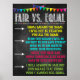 Fair vs. Equal Poster, das in einem Klassenzimmer, Schulbüro, Schulhalle, Lunchroom, Schulberatungsbüro, Beratungsbüro, Kindertherapeut, Hauptbüro, Schulpsychologin, Sozialarbeiterbüro, Schulbüro für Sozialarbeiter oder Kinderpsychologe verwendet wird. Das ist eine großartige, inspirierend und zum Nachdenken anregende Kunstdekoration. Eine Erklärung für den Unterschied zwischen fair und gleichwertig. Eine großartige, farbenfrohe, auffällige Grafik, die die Aufmerksamkeit der Kinder erregt und sie an die Fairness erinnert, ist nicht immer so, wie es aussieht! Helle Farben vor einem Imitat-Chalkboard Hintergrund.